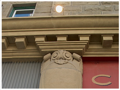 Sandpainting is used to mimic the appearance of sandstone. The lower crown and dental trim of theGrain Exchange building are predominantly made of tin. This application will help throw the eye to mislead the viewer into believing its sandstone.